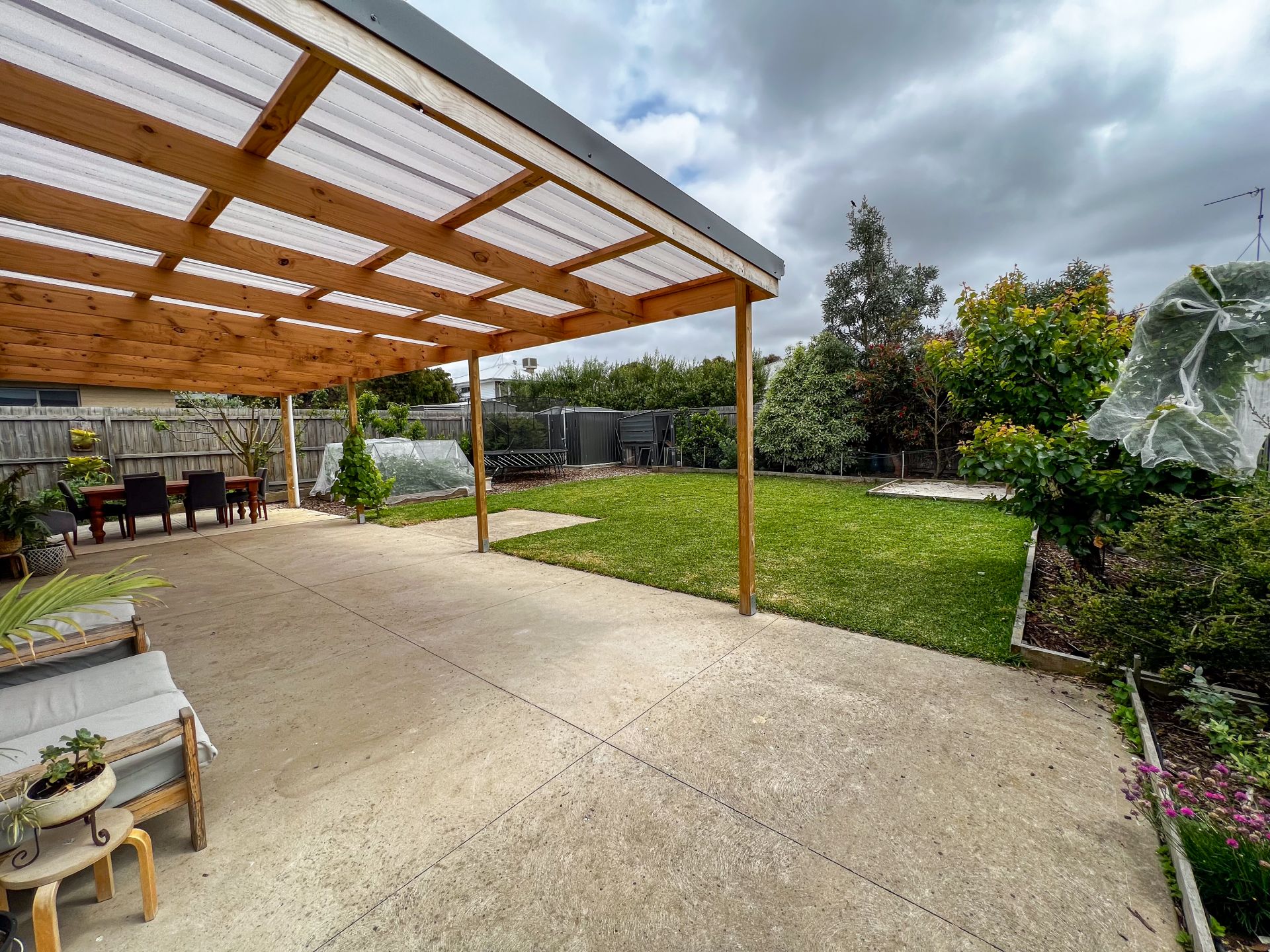 A secondary living area caters to the family's needs, providing an ideal play zone for children. The remaining bedrooms are serviced by a central bathroom with a soothing bath. Stay cozy throughout the seasons with ducted heating, while a split system in the main living area ensures climate control. The rear garden is a paradise, offering both play space and garden beds with veggie patches. A garden shed adds practicality, providing ideal storage for all your essentials. Don't miss the chance to make this exceptional residence your home!