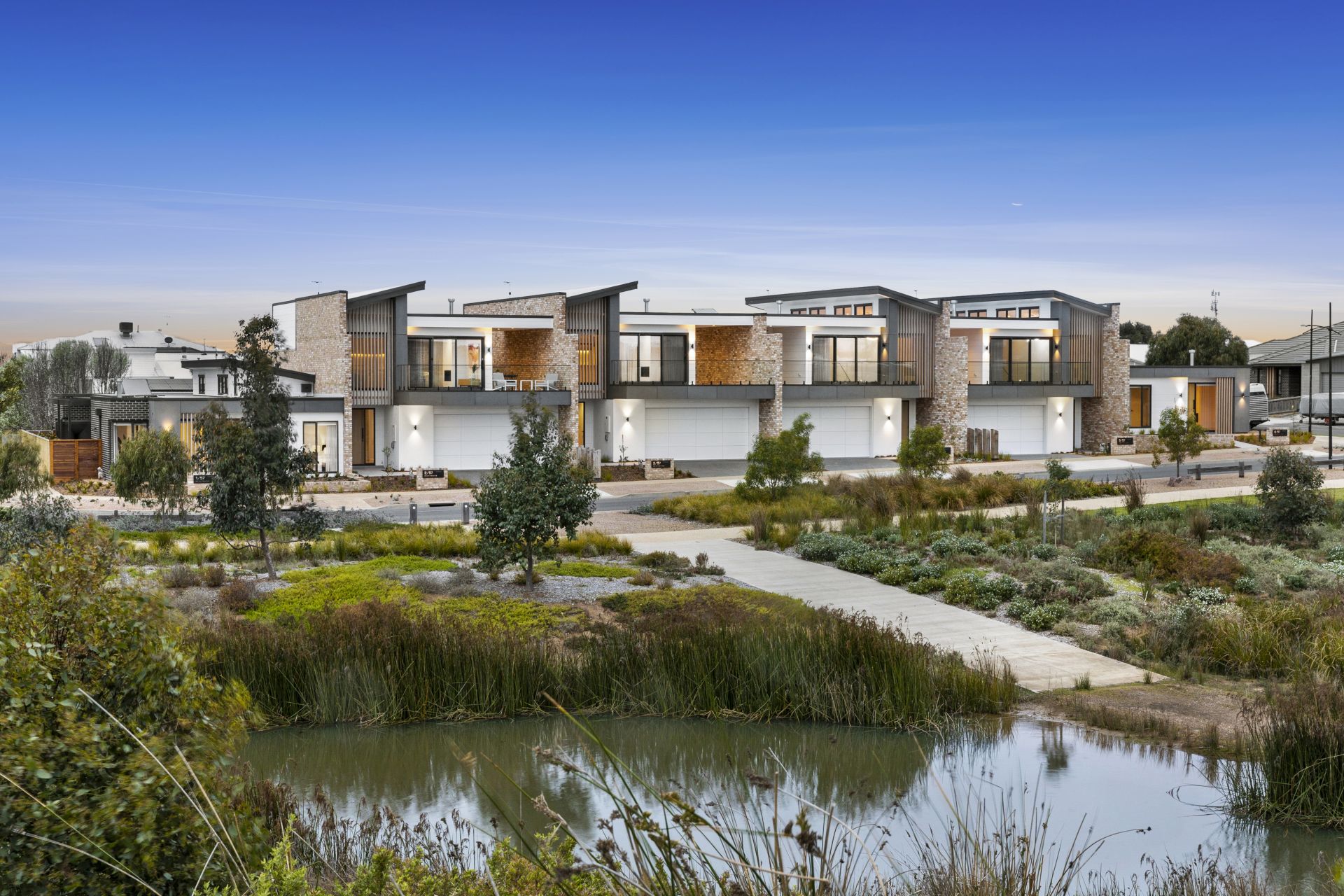 Each of the six townhouses has been meticulously planned to strike a harmonious balance between form and function. The architectural design effortlessly marries contemporary aesthetics with timeless elegance. Offering views of the wetlands, the clean lines, expansive glass features, and a modern colour palette exude sophistication while fostering a sense of openness and connection to the surroundings.