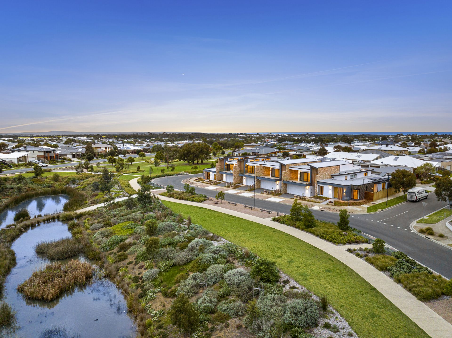 Each of the six townhouses has been meticulously planned to strike a harmonious balance between form and function. The architectural design effortlessly marries contemporary aesthetics with timeless elegance. Offering views of the wetlands, the clean lines, expansive glass features, and a modern colour palette exude sophistication while fostering a sense of openness and connection to the surroundings.