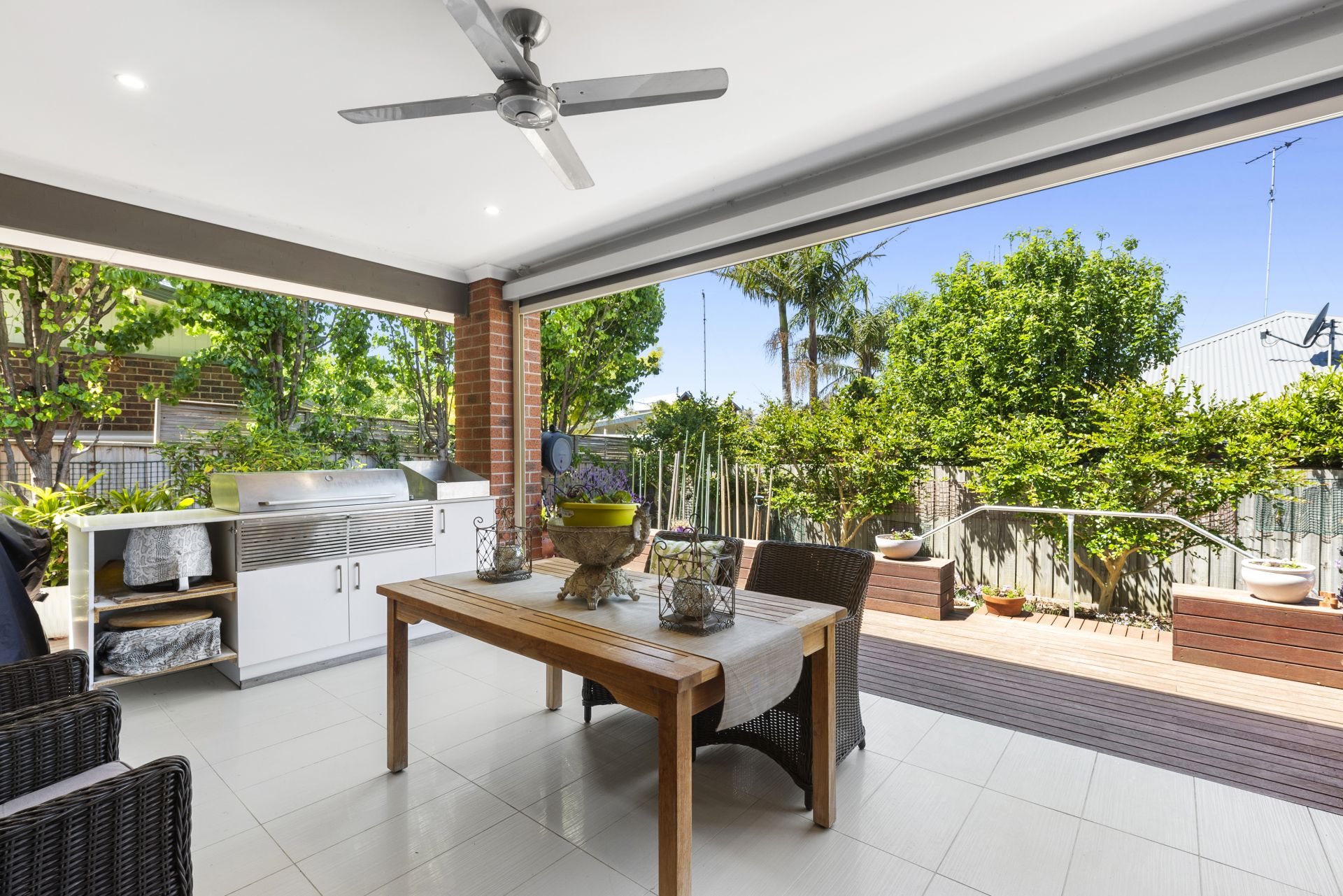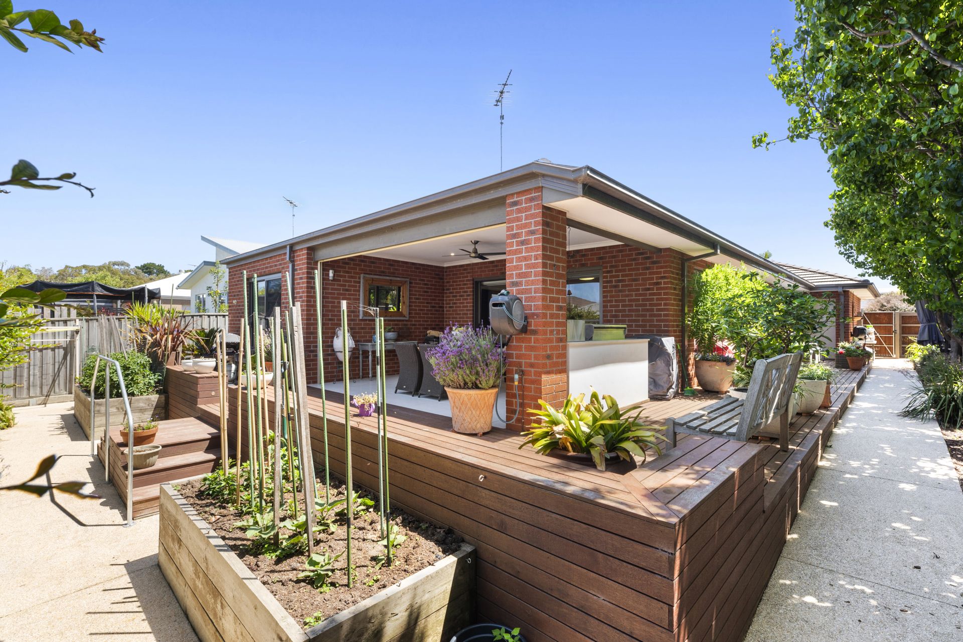 Elevated ceilings and expansive glazed windows bathe the interiors in natural light, allowing you to bask in the full north aspect. The integration effortlessly extends to the wrap-around deck, alfresco area, and well-established backyard. The home boasts three bedrooms, with the master tucked away featuring built-in robes, an ensuite, and rear access to the lush gardens and patio. The additional bedrooms are served by a central bathroom.