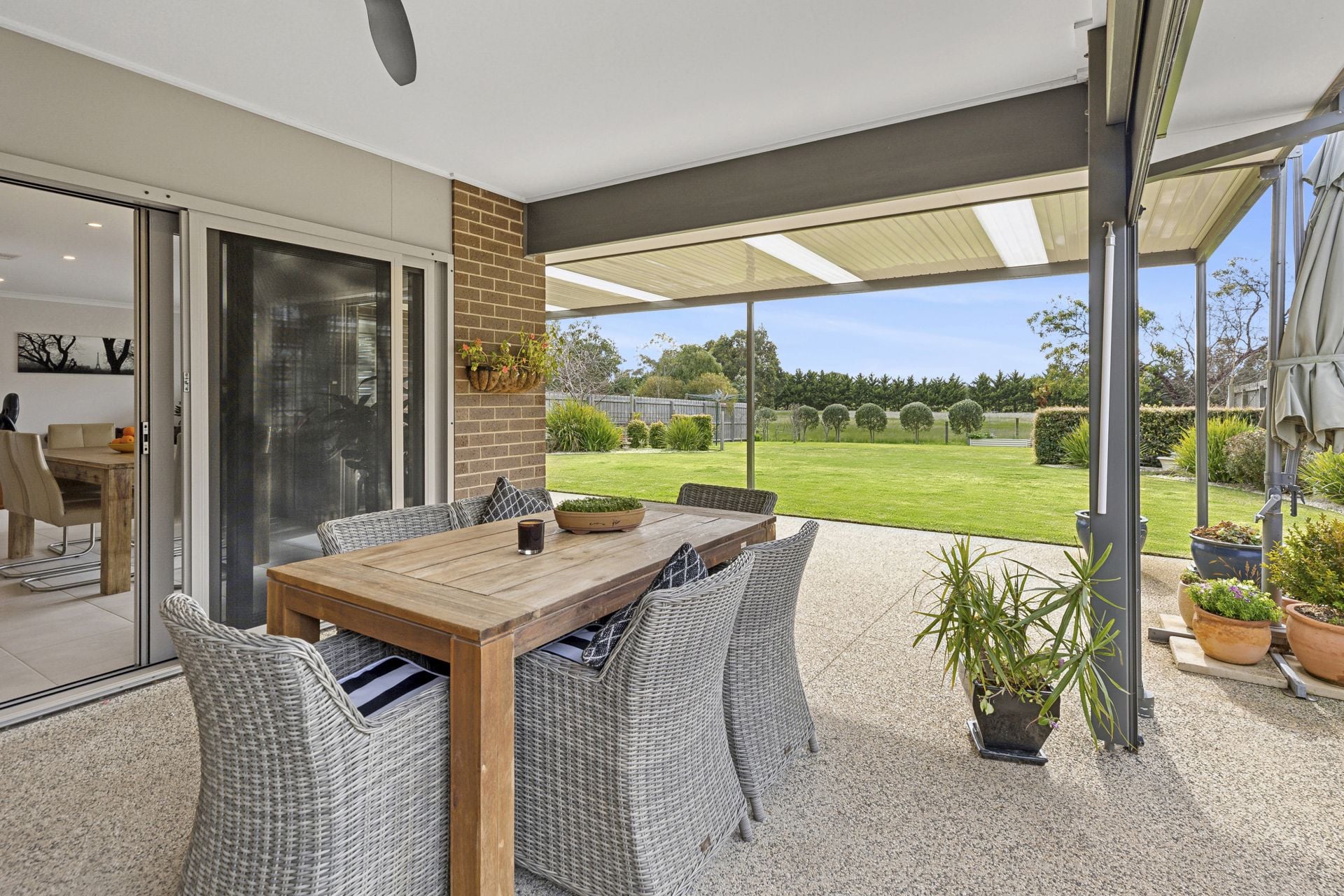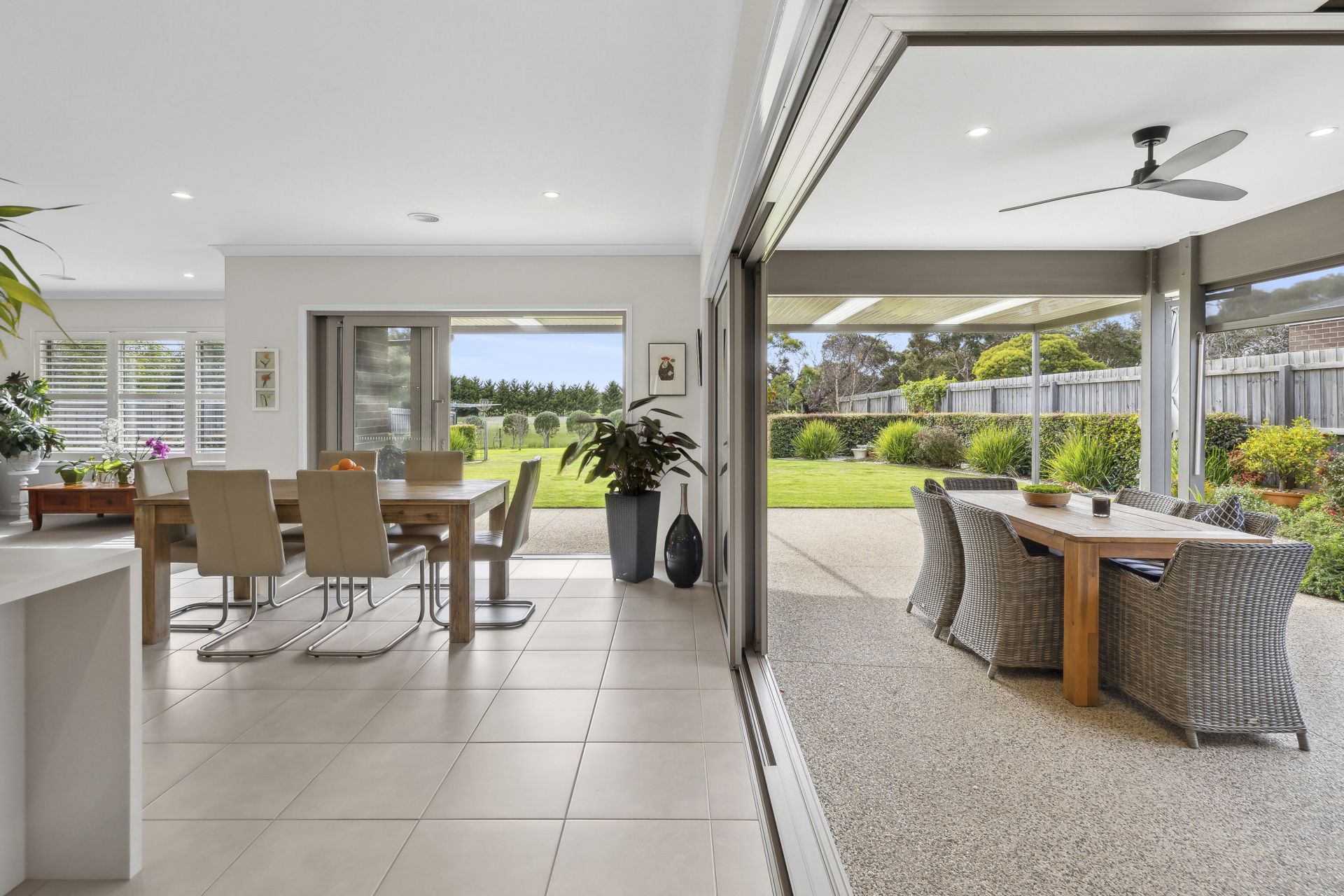 • Oversized alfresco with café-style blind and ceiling fan